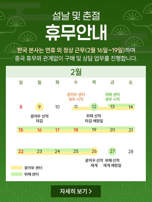 중국 휴무와 관계없이 구매 및 상담업무를 진행합니다